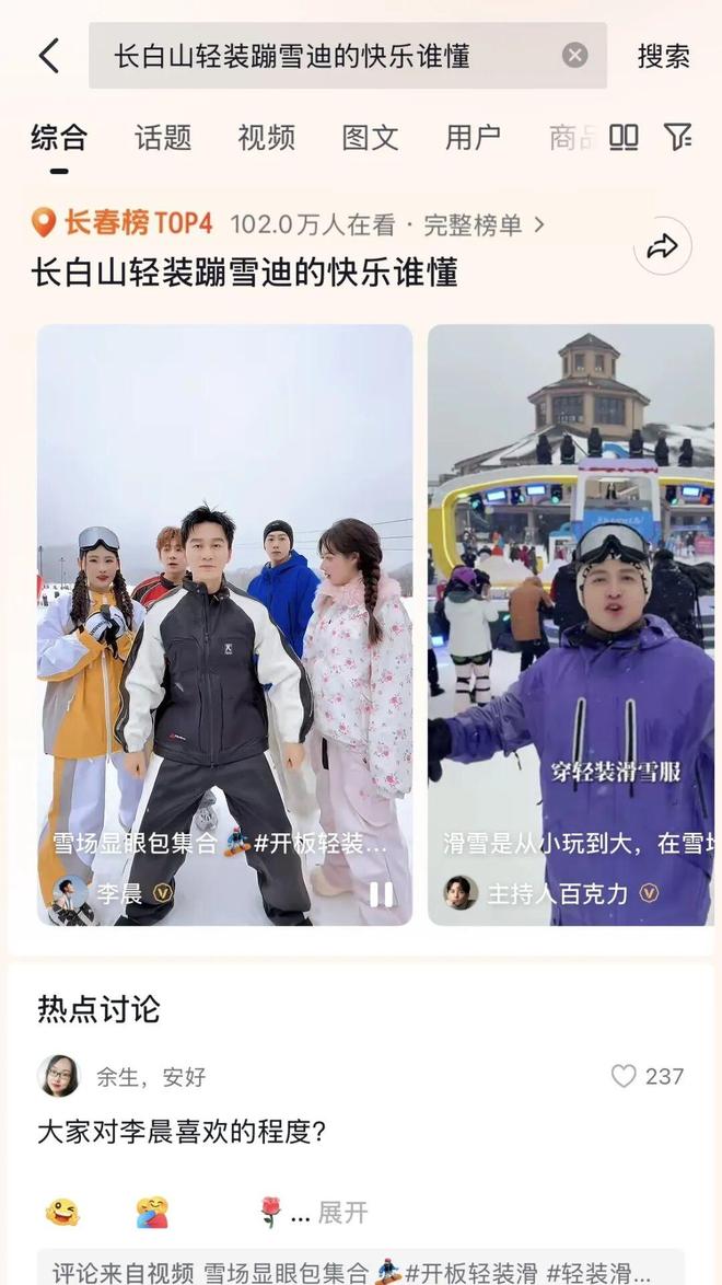 03 抖音助力“轻装滑”趋势 这个冬季,滑雪逐渐成为日常一幕,少不了抖音在滑雪浪潮中的发力,线上线下多维助力“轻装滑”趋势。 线上,抖音集结明星阵容,以真实、轻松的视角演绎“轻装滑”生活,丁嘉文从片场秒切雪场,李晨从客厅直达开板现场,陈伟霆则从酒店瞬移雪道,场景切换之间,传递出“随时出发,轻盈入雪”的态度。李晨、周琼洁、吴莫愁等明星还担任了“轻装户外推荐官”,引领大众体验滑雪中的 chill 时刻。