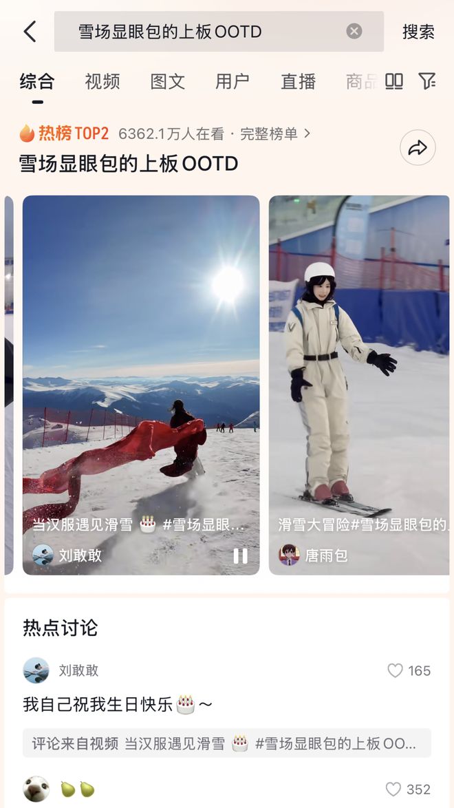 这些场景转换不仅毫无违和感,还充满了参与同款视频拍摄的吸引力。毕竟简约舒适风格的雪服,只要通过搭配不同的裤子和配饰,就能实现从城市到雪场的风格转换。 这也显示了“轻装滑”装备的特征,它既是满足运动场合的功能性服饰,又是一种融入日常、彰显品位的户外美学,轻量化的装备设计减少运动负担,带来“说走就走”的轻松感。 在抖音上,滑雪已从一项专业运动升级为一种生活方式与时尚表达,即让大家卸下传统滑雪繁重的装备与竞技压力,选择饱和度低、设计简约的轻量化雪服装备,实现从城市到雪场的无缝衔接,回归滑雪最本真的快乐,这也是“轻装滑”的核心本质。