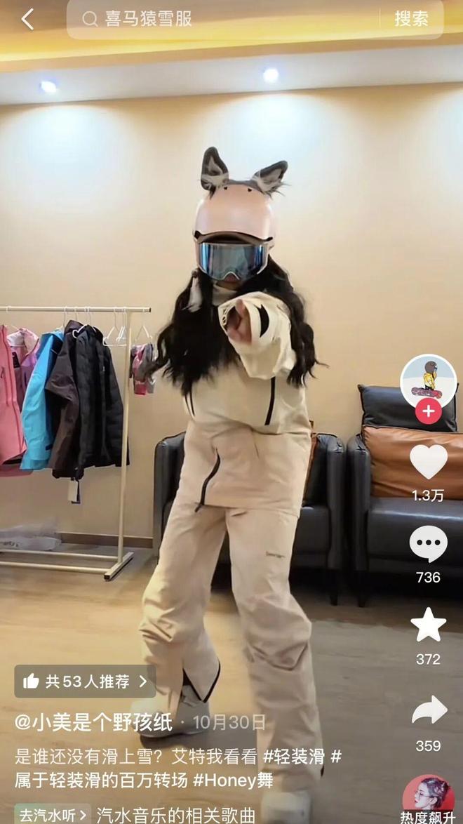 02 轻装上阵 与追求松弛治愈的滑雪体验相呼应,年轻一代在装备选择上也正告别“重工”思维。“轻装滑”作为一种全新趋势,已迅速风靡国内各大雪场,成为冬季户外的新风尚。 传统“重装滑”装备厚重,讲究功能至上,更契合高竞技需求,而“轻装滑”装备,更偏向轻量化与简约设计,主打轻装上阵,实现跨场景的自由切换。我们同样可以从抖音热门滑雪内容来感受: 当周五的下班时间到,办公室里的“都市雪人”便会现出原形,他们早已装备在身,可以将下班轨迹无缝切换成奔赴雪场的路线; 有人傍晚在公园散步,突然想去滑雪,轻轻跑起,转身即可融入冰雪世界; 有人在家中,身穿一套保暖简约的“轻装滑”OOTD,打开抖音点击特效,一键即可进入毛茸茸冰雪世界,开启美萌的轻快滑雪模式。
